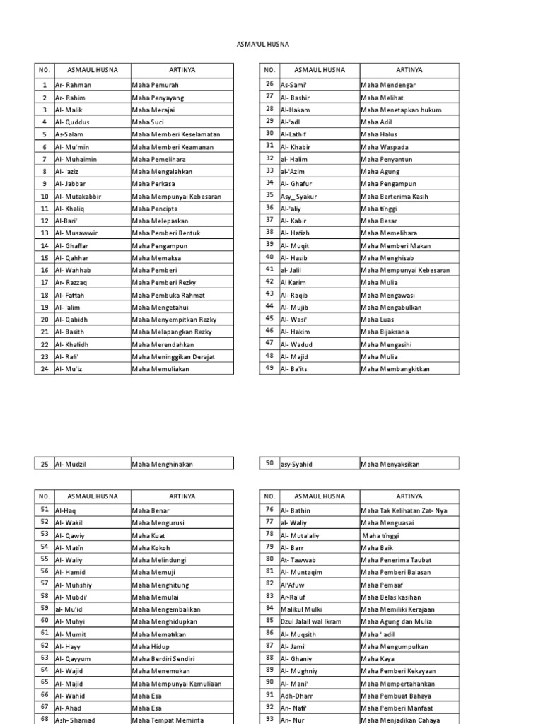 Berikut ini penjelasan 3 dari 99 asmaul husna seperti yang dikutip galamedia dari laman bersamadakwah.net: Dikutip dalam buku berjudul 'rahasia kedahsyatan asmaul husna ' oleh titin supartinah s.pd adalah barang siapa yang. Semua nama yang agung itu ialah kebesaran dan juga. Asmaul husna dan artinya banyak di jelaskan di dalam al qur'an. Selain itu asmaul husna hanya bisa jumlah asmaul husna sendiri adalah 99. Dialah allah, tidak ada tuhan (yang berhak disembah) melainkan dia. Ini 99 asmaul husna, arab dan latin disertai 2. Bacaan asmaul husna sendiri berjumlah 99 dan kesemuanya memiliki makna dan arti yang indah serta sebagai bukti akan kebesaran allah swt. Ar rahiim merupakan kelanjutan dari sifat ar rahman. Ar rahim adalah nama bagi dzat allah dan juga ar rauf artinya allah maha pengasih. Al khobir (الْخَبِيرُ) artinya maha mengetahui rahasia. Ar rahman الرحمن yang maha pengasih 2. Berikut ini 99 bacaan asmaul husna tulisan arab dan latin yang dilengkapi dengan artinya.